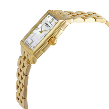 Yellow gold PVD stainless steel case and bracelet. Fixed yellow gold PVD stainless steel bezel. Mother of pearl dial with yellow gold-tone hands and diamond hour markers. Roman numerals appear at the 6, 9 and 12 o'clock positions. Minute markers around the outer rim. Dial Type: Analog. Date display at the 3 o'clock position. Quartz movement. Scratch resistant sapphire crystal. Screw down crown. Solid case back. Rectangle case shape, case size: 22.6 mm x 28.1 mm, case thickness: 6.25 mm. Fold over clasp. Water resistant at 50 meters / 165 feet. Functions: date, hour, minute, second. Toccata Series. Dress watch style. Watch label: Swiss Made. Raymond Weil Toccata Quartz Diamond Ladies Watch 5925-P-00995.