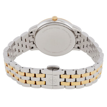 Silver-tone stainless steel case with a two-tone (silver-tone and yellow gold PVD) stainless steel bracelet. Fixed yellow gold PVD stainless steel bezel. White mother of pearl dial with yellow gold PVD hands and diamond hour markers. Dial Type: Analog. Date display at the 3 o'clock position. Quartz movement. Scratch resistant sapphire crystal. Pull / push crown. Solid case back. Round case shape, case size: 34 mm, case thickness: 7 mm. Band width: 16 mm. Fold over clasp with a safety release. Water resistant at 50 meters / 165 feet. Functions: date, hour, minute. Additional Info: number of diamonds: 11; diamonds carats: 0.04 kt ct; dial diamonds type: single cut 8/8 - si1. Toccata Series. Dress watch style. Watch label: Swiss Made. Raymond Weil Toccata Quartz Diamond White Mother of Pearl Dial Ladies Watch 5385-STP-97081.