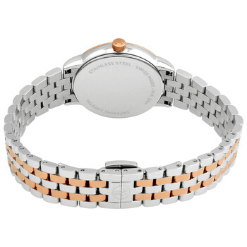 Silver-tone stainless steel case with a two-tone (silver-tone and rose gold PVD) stainless steel bracelet. Fixed rose gold PVD stainless steel bezel. White mother of pearl dial with rose gold-tone hands and diamond hour markers. Minute markers around the outer rim. Dial Type: Analog. Date display at the 3 o'clock position. Quartz movement. Scratch resistant sapphire crystal. Pull / push crown. Solid case back. Round case shape, case size: 29 mm, case thickness: 6 mm. Fold over clasp with a safety release. Water resistant at 50 meters / 165 feet. Functions: date, hour, minute. Additional Info: dial set with 11 single cut 8/8 - si1 diamonds - 0.036 kt ct. Toccata Series. Dress watch style. Watch label: Swiss Made. Raymond Weil Toccata Quartz Diamond White Mother of Pearl Dial Ladies Watch 5985-SP5-97081.