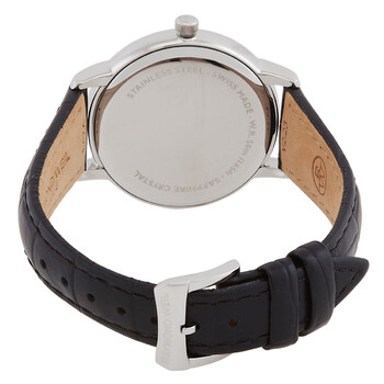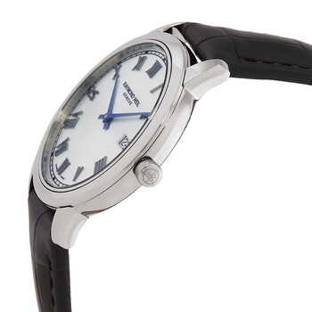 Silver-tone stainless steel case with a black leather strap. Fixed silver-tone stainless steel bezel. Silver dial with blue hands and Roman numeral hour markers. Minute markers around the outer rim. Dial Type: Analog. Date display at the 3 o'clock position. Quartz movement. Scratch resistant sapphire crystal. Pull / push crown. Solid case back. Round case shape, case size: 34 mm, case thickness: 7 mm. Band width: 16 mm. Buckle clasp. Water resistant at 50 meters / 165 feet. Functions: date, hour, minute, second. Toccata Series. Casual watch style. Watch label: Swiss Made. Raymond Weil Toccata Quartz Silver Dial Ladies Watch 5385-STC-00659.