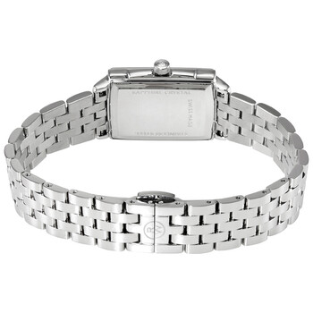 Silver-tone stainless steel case and bracelet. Fixed silver-tone stainless steel bezel. White dial with silver-tone hands and Roman numeral hour markers. Minute markers around the outer rim. Dial Type: Analog. Date display at the 3 o'clock position. Quartz movement. Scratch resistant sapphire crystal. Screw down crown. Solid case back. Rectangle case shape, case size: 22.6 x 28.1 mm, case thickness: 6.25 mm. Band width: 18 mm. Fold over clasp. Water resistant at 50 meters / 165 feet. Functions: date, hour, minute, second. Toccata Series. Casual watch style. Watch label: Swiss Made. Raymond Weil Toccata Quartz White Dial Ladies Watch 5925-ST-00300.