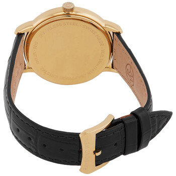 Yellow gold PVD stainless steel case with a black leather strap. Fixed yellow gold PVD stainless steel bezel. White dial with blue hands and Roman numeral hour markers. Minute markers around the outer rim. Dial Type: Analog. Date display at the 3 o'clock position. Quartz movement. Scratch resistant sapphire crystal. Pull / push crown. Solid case back. Round case shape, case size: 39 mm, case thickness: 7.89 mm. Band width: 19 mm. Buckle clasp. Water resistant at 50 meters / 165 feet. Functions: date, hour, minute. Toccata Series. Casual watch style. Watch label: Swiss Made. Raymond Weil Toccata Quartz White Dial Men's Watch 5485-PC-00359.