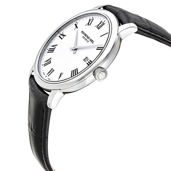 Stainless steel case with a black (calfskin) leather strap. Fixed stainless steel bezel. White dial with silver-tone hands and Roman numeral hour markers. Minute markers around the outer rim. Dial Type: Analog. Date display at the 3 o'clock position. Quartz movement. Scratch resistant sapphire crystal. Pull / push crown. Solid case back. Round case shape. Case size: 39 mm. Case thickness: 7.89 mm. Band width: 20 mm. Tang clasp. Water resistant at 50 meters / 165 feet. Functions: date, hour, minute, second. Dress watch style. Watch label: Swiss Made. Raymond Weil Toccata Quartz White Dial Men's Watch 5485-STC-00300.