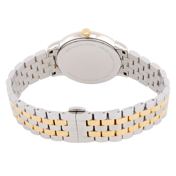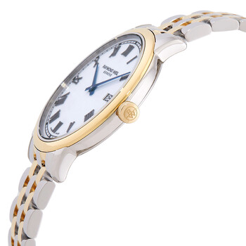 Silver-tone stainless steel case with a two-tone (silver-tone and yellow gold-tone) stainless steel bracelet. Fixed yellow gold-tone stainless steel bezel. White dial with blue hands and Roman numeral hour markers. Minute markers around the outer rim. Dial Type: Analog. Date display at the 3 o'clock position. Quartz movement. Round case shape, case size: 39 mm. Fold over clasp with a safety release. Functions: date, hour, minute, second. Toccata Series. Dress watch style. Watch label: Swiss Made. Raymond Weil Toccata Quartz White Dial Men's Watch 5485-STP-00359.