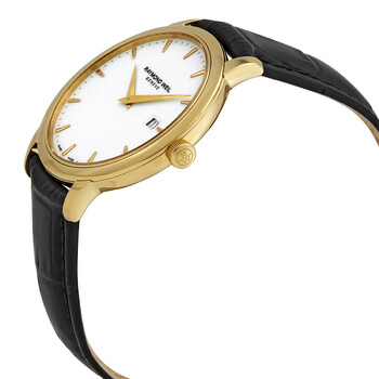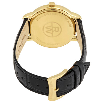 Yellow gold PVD stainless steel case with a black leather strap. Fixed yellow gold PVD bezel. White dial with yellow gold-tone hands and index hour markers. Minute markers around the outer rim. Dial Type: Analog. Date display at the 3 o'clock position. Quartz movement. Scratch resistant sapphire crystal. Pull / push crown. Solid case back. Round case shape. Case size: 39 mm. Case thickness: 7.89 mm. Band width: 20 mm. Tang clasp. Water resistant at 50 meters / 165 feet. Functions: date, hour, minute. Toccata Series. Dress watch style. Watch label: Swiss Made. Raymond Weil Toccata Quartz White Dial Men's Watch 5488-PC-30001.