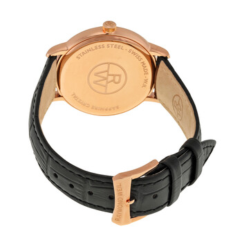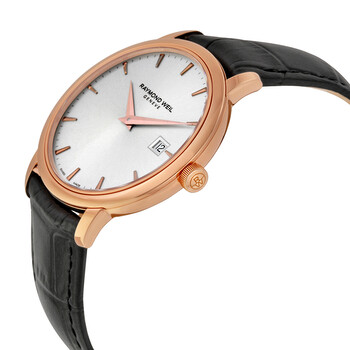 Rose gold PVD stainless steel case with a black (alligator) leather strap. Fixed rose gold PVD bezel. Silver dial with rose gold-tone hands and index hour markers. Minute markers around the outer rim. Dial Type: Analog. Date display at the 3 o'clock position. Quartz movement. Scratch resistant sapphire crystal. Pull / push crown. Solid case back. Case size: 39.5 mm. Case thickness: 9.15 mm. Round case shape. Band width: 20.3 mm. Band length: 8 inches. Tang clasp. Water resistant at 50 meters / 165 feet. Functions: date, hour, minute, second. Dress watch style. Watch label: Swiss Made. Item Variations: 5488 PC5 65001, 5488.PC5.65001, 5488PC565001. Raymond Weil Toccata Silver Dial Men's Watch 5488-PC5-65001.