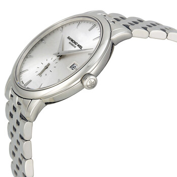 Stainless steel case with a stainless steel bracelet. Fixed stainless steel bezel. Silver dial with silver-tone hands and index hour markers. Minute markers around the outer rim. Dial Type: Analog. Date display at the 3 o'clock position. Small seconds sub-dial above the 6 o'clock position. Quartz movement. Scratch resistant sapphire crystal. Pull / push crown. Solid case back. Round case shape. Case size: 39 mm. Case thickness: 8 mm. Band width: 19 mm, band length: 7.75 inches. Deployment clasp. Water resistant at 50 meters / 165 feet. Functions: date, hour, minute, second. Toccata Series. Casual watch style. Watch label: Swiss Made. Item Variations: RW 5484 ST 65001, RW.5484.ST.65001, RW5484ST65001. Raymond Weil Toccata Silver Dial Men's Watch RW-5484-ST-65001.