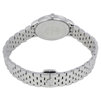 Stainless steel case with a stainless steel bracelet. Fixed stainless steel bezel. White dial with silver-tone hands and Arabic numeral hour markers. Minute markers around the outer rim. Dial Type: Analog. Date display at the 3 o'clock position. Quartz movement. Scratch resistant sapphire crystal. Pull / push crown. Solid case back. Case diameter: 29 mm. Case thickness: 6.79 mm. Round case shape. Fold over clasp with a double push-security release. Water resistant at 50 meters / 165 feet. Functions: date, hour, minute, second. Casual watch style. Raymond Weil Toccata White Dial Stainless Steel Ladies Watch RW-5988-ST-00300.