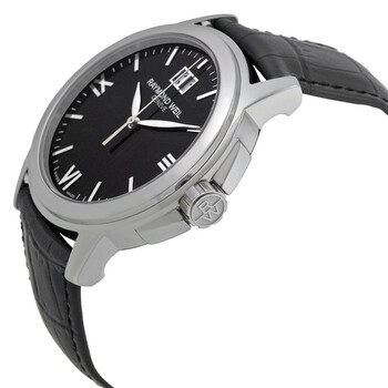 Stainless steel case with a black leather strap. Fixed stainless steel bezel. Black dial with silver- tone hands and index hour markers. Roman numerals mark the 3, 6, and 9 o'clock position. Minute markers around the outer rim. Dial Type: Analog. Date display appears at the 12 o'clock position. Quartz movement. Scratch resistant sapphire crystal. RW logo crown. Solid case back. Case diameter: 41 mm. Case thickness: 10.5 mm. Round case shape. Band width: 20 mm. Deployment clasp. Water resistant at 30 meters / 100 feet. Functions: hours, minutes, seconds, calendar. Casual watch style. Watch label: Swiss Made. Item Variations: 5576ST00207. Raymond Weil Tradition Black Dial Men's Watch 5576-ST-00207.