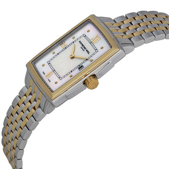 Stainless steel case with a two-tone (silver and yellow gold-plated) stainless steel bracelet. Fixed yellow gold-plated bezel. Mother of pearl dial with luminous hands and dot hour markers. Roman numerals mark the 6, 9 and 12 o'clock positions. Minute markers in inner rectangle. Dial Type: Analog. Date display at the 3 o'clock position. Quartz movement. Scratch resistant sapphire crystal. Pull / push crown. Solid case back. Case dimensions: 28.5 mm x 23.5 mm mm. Case thickness: 6 mm. Rectangle case shape. Brcaelet width: 15 mm. Deployment clasp with a push button release. Water resistant at 50 meters / 165 feet. Functions: hour, minute. Dress watch style. Watch label: Swiss Made. Raymond Weil Tradition Slim Mother of Pearl Ladies Watch 5956-STP-00915.
