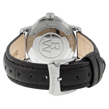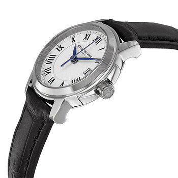 Stainless steel case with a black leather strap. Fixed stainless steel bezel. White dial with blue-toned hands and Roman numeral hour markers. Minute markers around the outer rim. Dial Type: Analog. Date display at the 3 o'clock position. Quartz movement. Scratch resistant sapphire crystal. Pull / push crown. Solid case abck. Case diameter: 27 mm. Round case shape. Tang clasp. Water resistant at 50 meters / 165 feet. Functions: date, hour, minute, second. Dress watch style. Watch label: Swiss Made. Raymond Weil Tradition White Dial Black Leather Ladies Watch 5378-STC-00300.