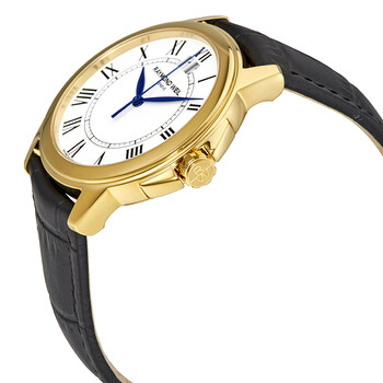 18kt yellow gold-plated stainless steel case with a black leather strap. Fixed 18kt yellow gold-plated stainless steel bezel. White dial with blue hands and Roman numeral hour markers. Minute markers aroundan inner ring. Dial Type: Analog. Date display at the 12 o'clock position. Quartz movement. Scratch resistant sapphire crystal. Screw down crown. Solid case back. Round case shape, case size: 39 mm, case thickness: 6 mm. Band width: 20 mm, band length: 8 inches. Tang clasp. Water resistant at 50 meters / 165 feet. Functions: date, hour, minute, second. Luxury watch style. Watch label: Swiss Made. Item Variations: 5476 P 00300, 5476.P.00300, 5476P00300. Raymond Weil Tradition White Dial Black Leather Men's Watch 5476-P-00300.