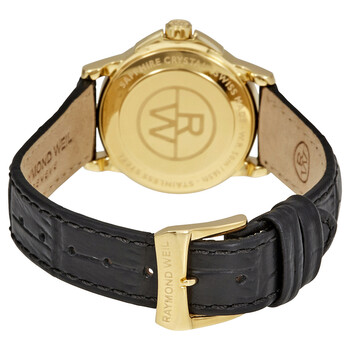 Yellow gold-plated stainless steel case with a black leather strap. Fixed yellow gold-plated bezel. White dial with yellow gold-tone hands and index hour markers. Roman numerals mark the 6, 9 and 12 o'clock positions. Minute markers around the outer rim. Dial Type: Analog. Date display at the 3 o'clock position. Quartz movement. Scratch resistant sapphire crystal. Pull / push crown. Solid case back. Case size: 27 mm. Round case shape. Band width: 14 mm. Tang clasp. Water resistant at 30 meters / 100 feet. Functions: date, hour, minute, second. Casual watch style. Watch label: Swiss Made. Item Variations: 5376 P 00307, 5376.P.00307, 5376P00307. Raymond Weil Tradition White Dial Ladies Watch 5376-P-00307.