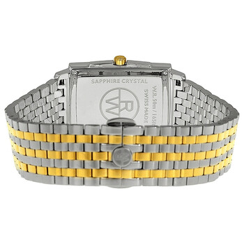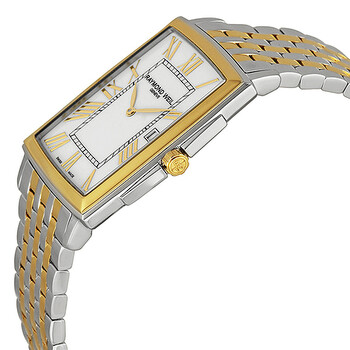 Stainless steel case with a two-tone (silver and yellow gold-tone) stainless steel bracelet. Fixed yellow gold-tone bezel. White dial with yellow gold-tone hands and Roman numeral hour markers. Minute markers around an inner ring. Dial Type: Analog. Date display at the 3 o'clock position. Quartz movement. Scratch resistant sapphire crystal. Pull / push crown. Solid case back. Case size: 29 mm. Case thickness: 6 mm. Rectangle case shape. Band width: 19 mm. Deployment clasp. Water resistant at 50 meters / 165 feet. Functions: date, day, hour, minute. Luxury watch style. Watch label: Swiss Made. Item Variations: 5456 STP 00308, 5456.STP.00308, 5456STP00308. Raymond Weil Tradition White Dial Men's Watch 5456-STP-00308.