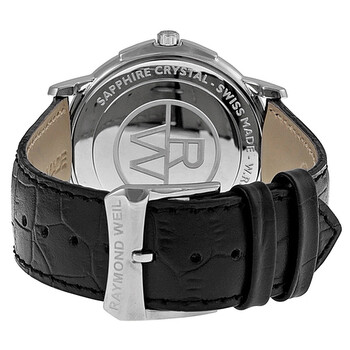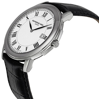 Stainless steel case with a black alligator leather strap. Fixed stainless steel bezel. White dial with black hands and Roman numeral hour markers. Minute markers around the outer rim. Dial Type: Analog. Date display at the 3 o'clock position. Quartz movement. Scratch resistant sapphire crystal. Pull / push crown. Solid case back. Case diameter: 40 mm. Case thickness: 6 mm. Round case shape. Strap width: 21 mm. Tang clasp. Water resistant at 50 meters / 165 feet. Functions: date, hour, minute. Casual watch style. Watch label: Swiss Made. Raymond Weil Tradition White Dial Men's Watch 54661-STC-00300.