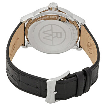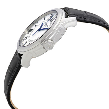 Stainless steel case with a black (croco-embossed) leather strap. Fixed stainless steel bezel. White dial with blue steel hands and Roman numeral hour markers. Minute markers around an inner ring. Dial Type: Analog. Date display at the 12 o'clock position. Quartz movement. Scratch resistant sapphire crystal. Pull / push crown. Solid case back. Round case shape. Case size: 41 mm. Case thickness: 11 mm. Band width: 22 mm. Band length: 7.5 inches. Tang clasp. Water resistant at 30 meters / 100 feet. Functions: hours, minutes, seconds, calendar. Additional Info: withstands rain and splashes of water, but not showering or submersion. Dress watch style. Watch label: Swiss Made. Item Variations: 5576 ST 00300, 5576.ST.00300, 5576ST00300. Raymond Weil Tradition White Dial Men's Watch 5576-ST-00300.