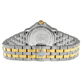 Stainless steel case with a two-tone (silver and yellow gold PVD) stainless steel bracelet. Fixed yellow gold PVD bezel. White dial with black hands and Roman numeral hour markers. Minute markers around an inner ring. Dial Type: Analog. Date display at the 3 o'clock position. Quartz movement. Scratch resistant sapphire crystal. Pull / push crown. Solid case back. Case diameter: 28 mm. Case thickness: 6.6 mm. Round case shape. Deployment clasp. Water resistant at 30 meters / 100 feet. Functions: date, hour, minute, second. Casual watch style. Watch label: Swiss Made. Raymond Weil Tradition White Dial Stainless Steel Ladies Watch 5391-STP-00300.