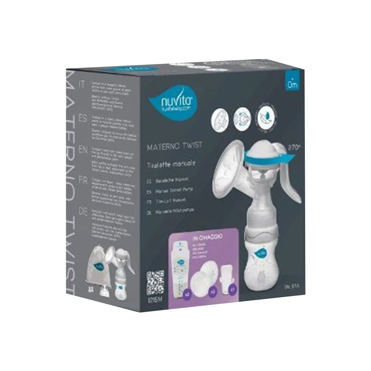 Nuvita-ს მექანიკური მკერდის ტუმბო ინოვაციური 270°-იანი მბრუნავი სახელურით, რომელიც გაცილებით კომფორტულია, ვიდრე ფიქსირებული სახელური, რათა თავიდან აიცილოთ ხელის დაღლა დედის რძის ამოღების დროს.