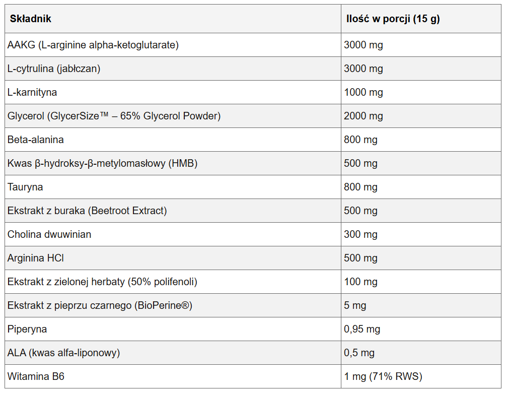 · მაქსიმალური კუნთის „დაბერვა“ (Pump): შეიცავს AAKG-ს, L-ციტრულინს და GlycerSize™-ს.