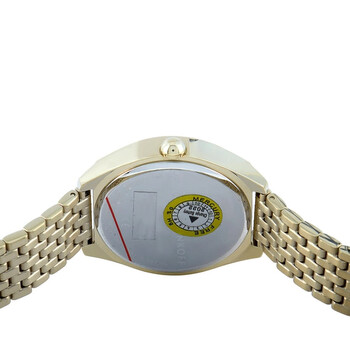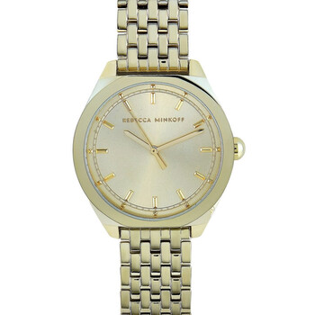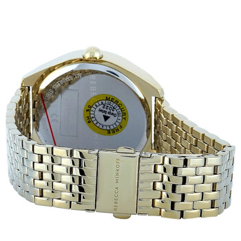 Gold-tone stainless steel case and bracelet. Fixed gold-tone bezel. Gold dial with gold-tone hands and index hour markers. Minute markers around the outer rim. Dial Type: Analog. Quartz movement. Scratch resistant mineral crystal. Pull / push crown. Solid case back. Round case shape. Case size: 38 mm. Case thickness: 7.6 mm. Band width: 17 mm. Fold over clasp with a push button release. Water resistant at 30 meters / 100 feet. Functions: hour, minute, second. Amari Series. Luxury watch style. Rebecca Minkoff Amari Quartz Gold Dial Ladies Watch 2200326.