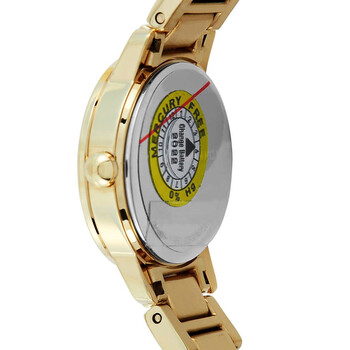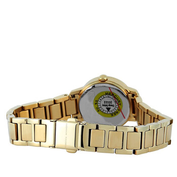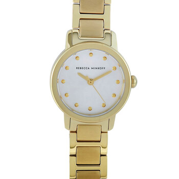 Gold-plated stainless steel case and bracelet. Fixed gold-plated bezel. Silver white dial with silver-tone hands and dot hour markers. Dial Type: Analog. Quartz movement. Scratch resistant mineral crystal. Pull / push crown. Solid case back. Round case shape. VCase size: 25 mm. Case thickness: 6.9 mm. Band width: 12 mm. Fold over clasp with a push button release. Water resistant at 30 meters / 100 feet. Functions: hour, minute, second. Bffl Series. Casual watch style. Rebecca Minkoff BFFL Quartz Silver White Dial Ladies Watch 2200333.
