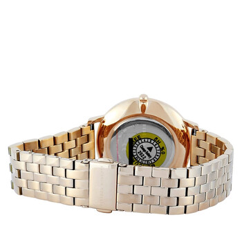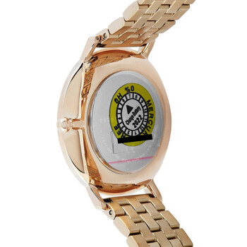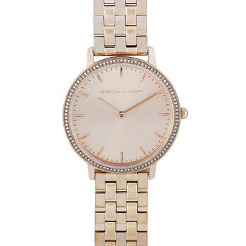 Carnation gold-tone stainless steel case and bracelet. Fixed carnation gold-tone bezel set with crystals. Carnation dial with carnation gold-tone hands and index hour markers. Minute markers around the outer rim. Dial Type: Analog. Quartz movement. Scratch resistant mineral crystal. Pull / push crown. Solid case back. Round case shape. Case size: 35 mm. Fold over clasp with a push button release. Water resistant at 30 meters / 100 feet. Functions: hour, minute, second. Major Series. Casual watch style. Rebecca Minkoff Major Quartz Crystal Carnation Gold Ladies Watch 2200349.