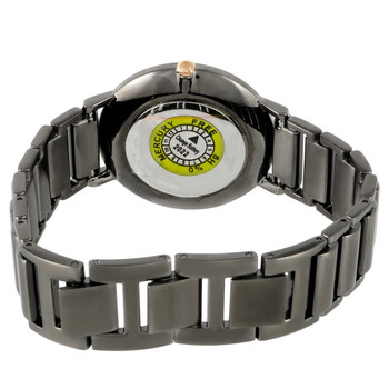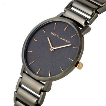 Grey ion-plated stainless steel case and bracelet. Fixed grey ion-plated bezel. Grey sandblasted dial with rose gold-tone hands and index hour markers. Dial Type: Analog. Quartz movement. Scratch resistant mineral crystal. Pull / push crown. Solid case back. Round case shape. Case size: 35 mm. Case thickness: 6.2 mm. Band width: 16 mm. Jewelry clasp. Water resistant at 30 meters / 100 feet. Functions: hour, minute. Major Series. Luxury watch style. Rebecca Minkoff Major Quartz Grey Sandblasted Dial Ladies Watch 2200261.