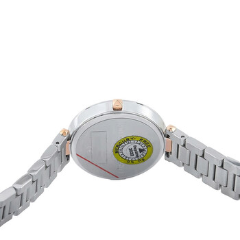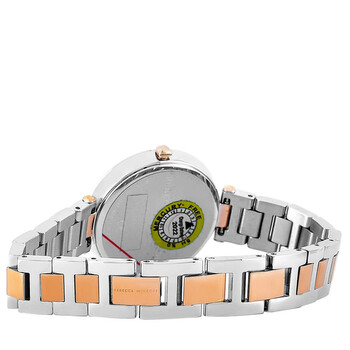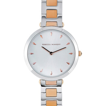Stainless steel case with a two-tone (silver-tone and rose gold-plated) stainless steel bracelet. Fixed stainless steel bezel. Silver white dial with rose gold-tone hands and index hour markers. Dial Type: Analog. Quartz movement. Scratch resistant mineral crystal. Pull / push crown. Solid case back. Round case shape. Case size: 33 mm. Case thickness: 6.9 mm. Band width: 13 mm. Jewelry clasp. Water resistant at 30 meters / 100 feet. Functions: hour, minute. Nina Series. Casual watch style. Rebecca Minkoff Nina Quartz Silver White Dial Ladies Watch 2200279.