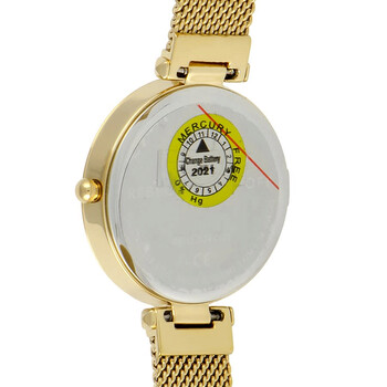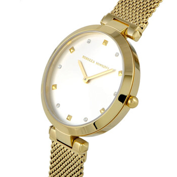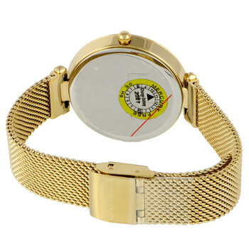 Gold-plated stainless steel case with a gold-plated stainless steel mesh bracelet. Fixed gold-plated bezel. Silver white dial with gold-tone hands and alternating crystal and index hour markers. Dial Type: Analog. Quartz movement. Scratch resistant mineral crystal. Pull / push crown. Solid case back. Round case shape. Case size: 33 mm. Case thickness: 6.9 mm. Band width: 13 mm. Fold over slip through clasp. Water resistant at 30 meters / 100 feet. Functions: hour, minute. Nina Series. Luxury watch style. Rebecca Minkoff Rebecca Minkoff Multi-Color Dial Ladies Watch 2200300.