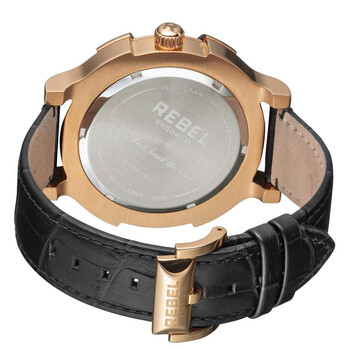 Rose gold-tone stainless steel case with a black leather strap. Fixed rose gold-tone stainless steel bezel. Black dial with rose gold-tone hands and index hour markers. Dial Type: Analog. Quartz movement. Scratch resistant mineral w/ sapphire coating crystal. Push/pull crown. Solid case back. Round case shape, case size: 48 mm, case thickness: 12 mm. Band width: 22 mm, band length: 8.5 inches. Tang clasp. Water resistant at 50 meters / 165 feet. Functions: hour, minute. Casual watch style. Rebel Brooklyn Bridge Black Dial Men's Watch RB102-8071.