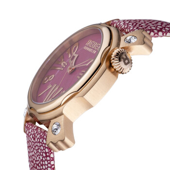 Silver-tone stainless steel case with a violet leather strap. Fixed silver-tone stainless steel bezel. Violet dial with gold-tone hands and Roman and Arabic numeral hour markers. Dial Type: Analog. Quartz movement. Scratch resistant mineral crystal crystal. Push/pull crown. Solid case back. Round case shape, case size: 44 mm, case thickness: 11 mm. Band width: 22 mm, band length: 7.5 inches. Buckle clasp. Water resistant at 50 meters / 165 feet. Functions: hour, minute, second. Casual watch style. Rebel Coney Island Men's Watch RB104-8081.