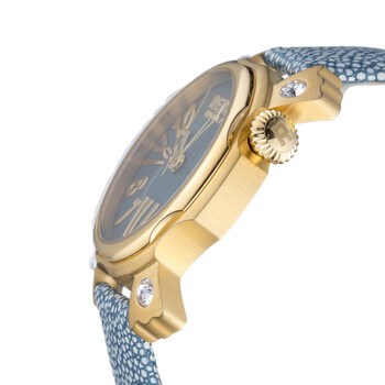 Gold-tone stainless steel case with a teal leather strap. Fixed gold-tone stainless steel bezel. Teal dial with gold-tone hands and Roman and Arabic numeral hour markers. Dial Type: Analog. Quartz movement. Scratch resistant mineral crystal crystal. Push/pull crown. Solid case back. Round case shape, case size: 44 mm, case thickness: 11 mm. Band width: 22 mm, band length: 7.5 inches. Buckle clasp. Water resistant at 50 meters / 165 feet. Functions: hour, minute, second. Casual watch style. Rebel Coney Island Quartz Men's Watch RB104-9121.