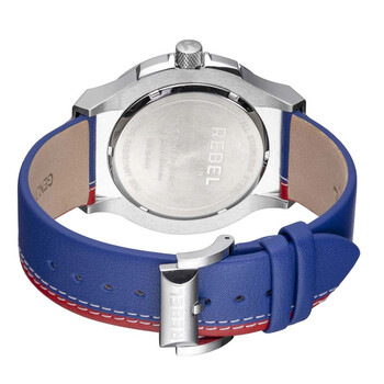 Silver-tone stainless steel case with a navy and red leather strap. Fixed silver-tone stainless steel bezel. Navy and red dial with silver-tone hands and index hour markers. Dial Type: Analog. One - 60 seconds subdial. Quartz movement. Scratch resistant mineral crystal. Push/pull crown. Solid case back. Round case shape, case size: 44 mm, case thickness: 11 mm. Band width: 23 mm, band length: 7.5 inches. Tang clasp. Water resistant at 50 meters / 165 feet. Functions: hour, minute, second. Casual watch style. Rebel Flatbush Ladies Watch RB119-4141.