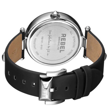 Stainless steel case with a black leather strap set with pryramid studs. Fixed stainless steel bezel set with black crystals. Silver dial with silver-tone hands. No markers. Dial Type: Analog. Quartz movement. Scratch resistant mineral crystal with a sapphire coating. Pull / push crown. Solid case back. Round case shape. Case size: 40 mm. Case thickness: 11 mm. Band width: 20 mm, band length: 7.5 inches. Tang clasp. Water resistant at 50 meters / 165 feet. Functions: hour, minute, second. Rockaway Parkway Series. Casual watch style. Rebel Rockaway Parkway Silver Dial Ladies Watch RB101-4071.