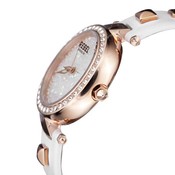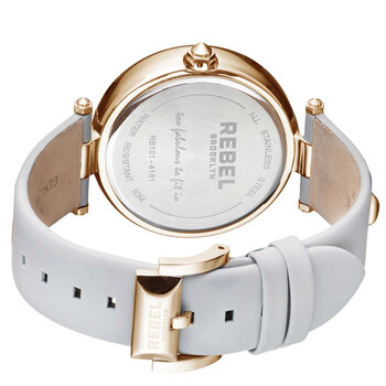 Gold-tone stainless steel case with a white leather strap. Fixed gold-tone stainless steel bezel. White dial with gold-tone hands. Dial Type: Analog. Quartz movement. Scratch resistant mineral w/ sapphire coating crystal. Push/pull crown. Solid case back. Round case shape, case size: 40 mm, case thickness: 11 mm. Band width: 20 mm, band length: 7.5 inches. Tang clasp. Water resistant at 50 meters / 165 feet. Functions: hour, minute, second. Casual watch style. Rebel Rockaway Parkway White Dial Ladies Watch RB101-8031.