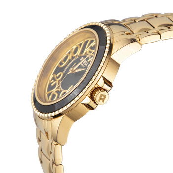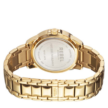 Gold-tone stainless steel case with a gold-tone stainless steel bracelet. Fixed gold-tone stainless steel bezel. Black dial with gold-tone hands and Arabic numeral hour markers. Dial Type: Analog. Quartz movement. Scratch resistant mineral w/ sapphire coating crystal. Push/pull crown. Solid case back. Round case shape, case size: 42 mm, case thickness: 11 mm. Band width: 22 mm, band length: 8.5 inches. Deployment clasp. Water resistant at 50 meters / 165 feet. Functions: hour, minute, second. Casual watch style. Rebel Williamsburg Black Dial Men's Watch RB107-9078.