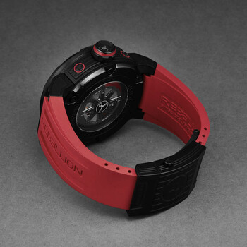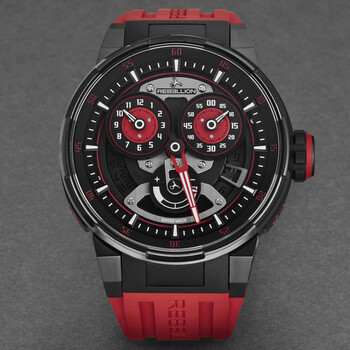 Black titanium case with a red rubber strap. Fixed black titanium bezel. Black dial with red hands and index hour markers. Minute markers around the outer rim. Dial Type: Analog. Date display at the 4 o'clock position. Automatic movement. Scratch resistant sapphire crystal. Screw down crown. Transparent case back. Round case shape, case size: 48 mm, case thickness: 18 mm. Band width: 30 mm. Fold over clasp with a safety release. Water resistant at 50 meters / 165 feet. Functions: chronograph, date, hour, minute, second. Additional Info: hours and minutes regulator, central seconds, date and power reserve indicator. Predator 2.0 Series. Luxury watch style. Rebellion Predator 2.0 Chronograph Automatic Black Dial Men's Watch RB.PR2.REG.TB.BKRD.