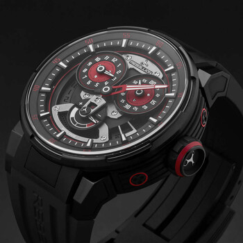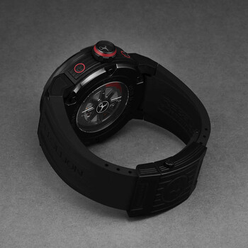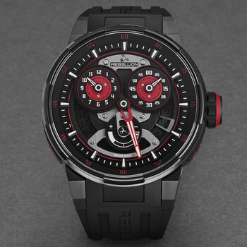 Black titanium case with a black rubber strap. Fixed black titanium bezel. Black dial with red hands and index hour markers. Minute markers around the outer rim. Dial Type: Analog. Luminescent hands and markers. Date display at the 4 o'clock position. Automatic movement. Scratch resistant sapphire crystal. Screw down crown. Transparent case back. Round case shape, case size: 48 mm, case thickness: 18 mm. Band width: 30 mm. Fold over clasp with a safety release. Water resistant at 50 meters / 165 feet. Functions: chronograph, date, hour, minute, second. Additional Info: the regulator power reserve indicator movement is based on a self-winding Swiss made movement developed exclusively for rebellion by telos watch. a un. Predator 2.0 Series. Luxury watch style. Rebellion Predator 2.0 Chronograph Automatic Black Dial Men's Watch RB.PR2.REG.TB.BKRD-1.