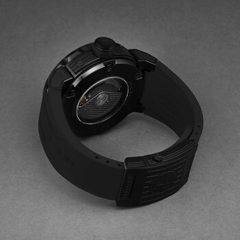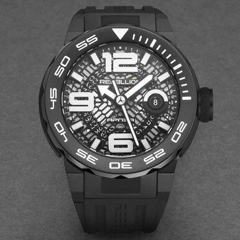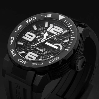 Black titanium case with a black rubber strap. Uni-directional rotating black titanium bezel. Black dial with black hands and Arabic numeral & index hour markers. Dial Type: Analog. Luminescent hands and markers. Date display at the 3 o'clock position. Automatic movement. Scratch resistant sapphire crystal. Screw down crown. Transparent case back. Round case shape, case size: 48 mm, case thickness: 16.7 mm. Band width: 30 mm. Deployment with push button release clasp. Water resistant at 100 meters / 330 feet. Functions: date, hour, minute, second. Additional Info: 4 hz (28,800 vph). Predator Apnea Series. Luxury watch style. Rebellion Predator Apnea Black Dial Men's Watch RB.PAP.3H.TB.WH-1.