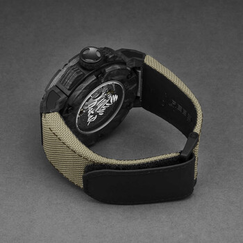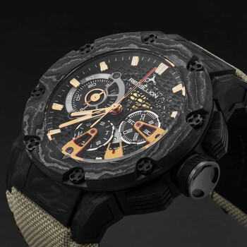 Black titanium case with a green velcro band. Fixed black carbon fiber bezel. Black dial with gold-tone hands and index hour markers. Dial Type: Analog. Luminescent hands and markers. Date display between 4 and 5 o'clock position. RE-1 A automatic movement. Scratch resistant sapphire crystal. Screw down crown. Transparent case back. Round case shape, case size: 48 mm, case thickness: 16.3 mm. Band width: 30 mm. Fold over clasp. Water resistant at 100 meters / 330 feet. Functions: chronograph, date, hour, minute, second. Additional Info: hours, minute, seconds, date, chronograph. Predator Series. Luxury watch style. Rebellion Predator Chronograph Automatic Black Dial Men's Watch RB.PR.CH.CA.DAK24.