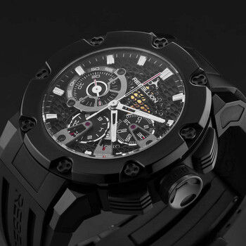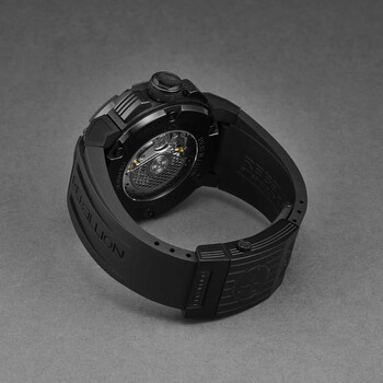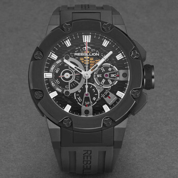 Black titanium case with a black rubber strap. Fixed black titanium bezel. Black dial with silver-tone hands and index hour markers. Minute markers around the outer rim. Dial Type: Analog. Luminescent hands and markers. Date display between 4 and 5 o'clock position. Chronograph - three sub-dials displaying: 60 second, 30 minute and 12 hour. RE-1 automatic movement. Scratch resistant sapphire crystal. Screw down crown. Transparent case back. Round case shape, case size: 48 mm, case thickness: 16.3 mm. Band width: 30 mm. Deployment with push button release clasp. Water resistant at 100 meters / 330 feet. Functions: chronograph, date, hour, minute, second. Additional Info: automatic winding, developed by concepto. Predator Series. Luxury watch style. Rebellion Predator Chronograph Automatic Black Dial Men's Watch RB.PR.CH.TB.BK.G2.