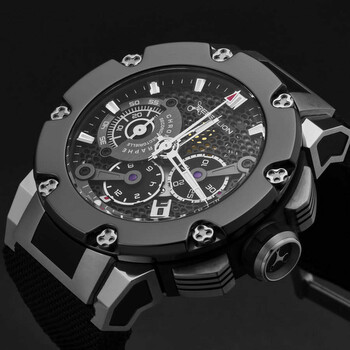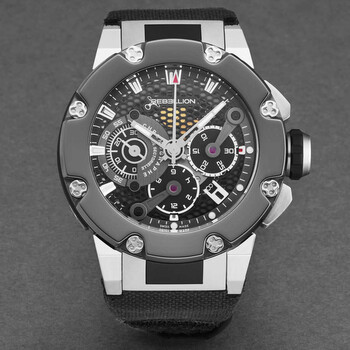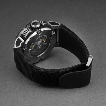 Grey titanium case with a black canvas strap. Fixed black titanium bezel. Black dial with silver-tone hands and index hour markers. Minute markers around the outer rim. Dial Type: Analog. Luminescent hands and markers. Date display between 4 and 5 o'clock position. Chronograph - three sub-dials displaying: 60 second, 30 minute and 12 hour. RE-1 Developed by Concepto automatic movement. Scratch resistant sapphire crystal. Screw down crown. Transparent case back. Round case shape, case size: 48 mm, case thickness: 16.3 mm. Band width: 30 mm. Fold over clasp with a safety release. Water resistant at 100 meters / 330 feet. Functions: chronograph, date, hour, minute, second. Predator Series. Luxury watch style. Rebellion Predator Chronograph Automatic Black Dial Men's Watch RB.PR.CH.TIBC.BK-3.