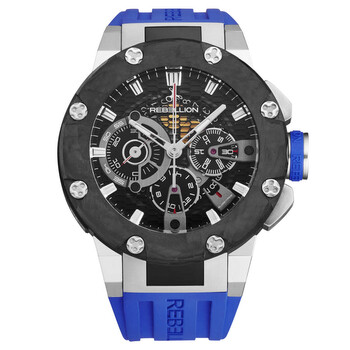 Silver-tone titanium case with a blue rubber strap. Fixed black carbon fiber bezel. Black dial with silver-tone hands and index hour markers. Minute markers around the outer rim. Dial Type: Analog. Luminescent hands and markers. Date display between 4 and 5 o'clock position. Chronograph - three sub-dials displaying: 60 second, 30 minute and 12 hour. RE-1 automatic movement. Scratch resistant sapphire crystal. Screw down crown. Transparent case back. Round case shape, case size: 48 mm, case thickness: 16.3 mm. Band width: 30 mm. Deployment with push button release clasp. Water resistant at 100 meters / 330 feet. Functions: chronograph, date, hour, minute, second. Additional Info: automatic winding, developed by concepto. Predator Series. Luxury watch style. Rebellion Predator Chronograph Automatic Black Dial Men's Watch RB.PR.CH.TICA.BK.