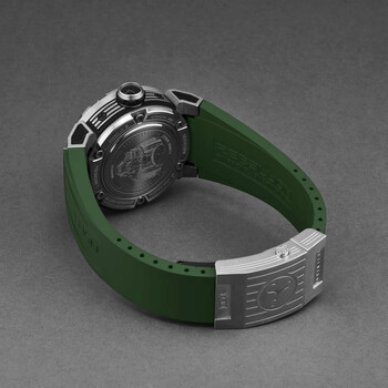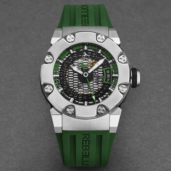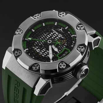 Silver-tone titanium case with a green rubber strap. Fixed silver-tone stainless steel bezel. Black dial with silver-tone hands and index hour markers. Dial Type: Analog. Luminescent hands and markers. Date display at the 3 o'clock position. Automatic movement. Scratch resistant sapphire crystal. Screw down crown. Solid case back. Round case shape, case size: 42 mm, case thickness: 16 mm. Band width: 30 mm. Deployment with push button release clasp. Water resistant at 50 meters / 165 feet. Functions: date, hour, minute, second. Additional Info: 4 hz (28,800 vph). Predator S Series. Luxury watch style. Watch label: Swiss Made. Rebellion Predator S Automatic Black Dial Men's Watch RB.PRS.3H.TI.GR.