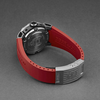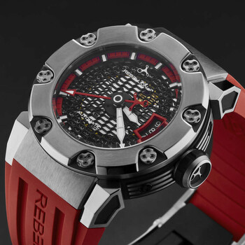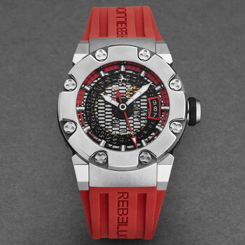 Silver-tone titanium case with a red rubber strap. Fixed black titanium bezel. Black dial with silver-tone hands and index hour markers. Dial Type: Analog. Luminescent hands and markers. Date display at the 3 o'clock position. Automatic movement. Scratch resistant sapphire crystal. Screw down crown. Solid case back. Round case shape, case size: 42 mm, case thickness: 16 mm. Band width: 30 mm. Deployment with push button release clasp. Water resistant at 50 meters / 165 feet. Functions: date, hour, minute, second. Additional Info: 4 hz (28,800 vph). Predator S Series. Luxury watch style. Watch label: Swiss Made. Rebellion Predator S Automatic Black Dial Men's Watch RB.PRS.3H.TI.RD.