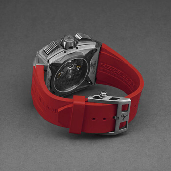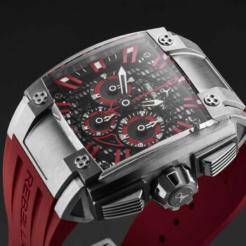 Silver-tone titanium case with a red rubber strap. Fixed silver-tone titanium bezel. Black dial with black hands and index hour markers. Minute markers around the outer rim. Dial Type: Analog. Luminescent hands and markers. Date display between 4 and 5 o'clock position. Chronograph - three sub-dials displaying: 60 second, 30 minute and 12 hour. Automatic movement. Scratch resistant sapphire crystal. Pull / push crown. Solid case back. Square case shape, case size: 42 mm, case thickness: 19 mm. Band width: 34 mm. Deployment with push button release clasp. Water resistant at 50 meters / 165 feet. Functions: chronograph, date, hour, minute, second. Re1 2.0 Series. Luxury watch style. Watch label: Swiss Made. Rebellion Re1 2.0 Chronograph Automatic Black Dial Men's Watch RB.RE12.CH.TI.RD.