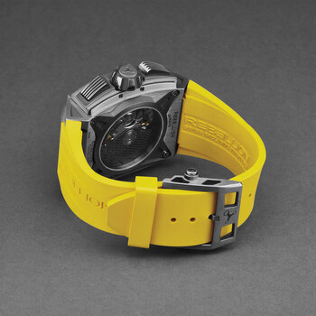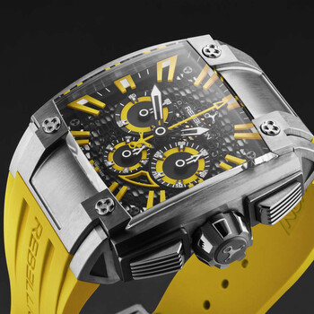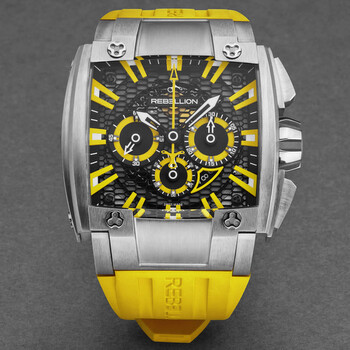 Silver-tone titanium case with a yellow rubber strap. Fixed silver-tone titanium bezel. Black dial with black hands and index hour markers. Minute markers around the outer rim. Dial Type: Analog. Luminescent hands and markers. Date display between 4 and 5 o'clock position. Chronograph - three sub-dials displaying: 60 second, 30 minute and 12 hour. Automatic movement. Scratch resistant sapphire crystal. Pull / push crown. Solid case back. Square case shape, case size: 42 mm, case thickness: 19 mm. Band width: 34 mm. Deployment with push button release clasp. Water resistant at 50 meters / 165 feet. Functions: chronograph, date, hour, minute, second. Re1 2.0 Series. Luxury watch style. Watch label: Swiss Made. Rebellion Re1 2.0 Chronograph Automatic Black Dial Men's Watch RB.RE12.CH.TI.YW.