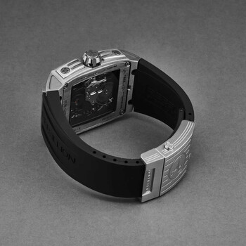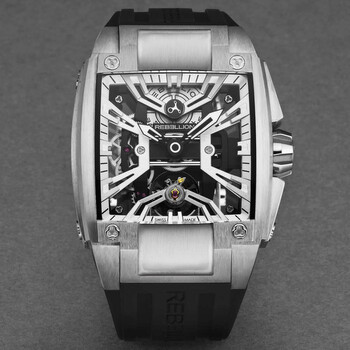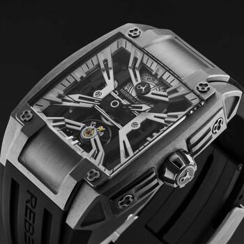 Silver-tone titanium case with a black rubber strap. Fixed silver-tone titanium bezel. Grey dial with black hands and index hour markers. Minute markers around the outer rim. Dial Type: Analog. Luminescent hands and markers. Automatic movement. Scratch resistant sapphire crystal. Pull / push crown. Solid case back. Rectangle case shape, case size: 40.35 mm, case thickness: 13.5 mm. Band width: 28 mm. Deployment with push button release clasp. Water resistant at 30 meters / 100 feet. Functions: hour, minute. Additional Info: skeletonized property movment manuel winding, 4 hz (28,800 vph). Re-volt Series. Luxury watch style. Rebellion Re-Volt Automatic Grey Dial Men's Watch RB.REV.2H.TI.RH.