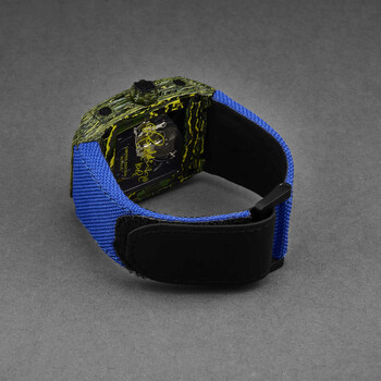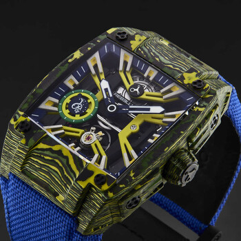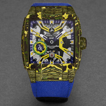 Multi-color fiber case with a blue canvas strap. Fixed green carbon fiber bezel. Yellow dial with black hands and index hour markers. Minute markers around the outer rim. Dial Type: Analog. Luminescent hands and markers. Automatic movement. Scratch resistant sapphire crystal. Pull / push crown. Transparent case back. Rectangle case shape, case size: 41.55 mm, case thickness: 12.5 mm. Band width: 30 mm. Fold over clasp. Water resistant at 30 meters / 100 feet. Functions: hour, minute, second. Additional Info: skeletonized property movment manuel winding, 4 hz (28,800 vph). Re-volt Series. Luxury watch style. Rebellion Re-Volt Automatic Men's Watch RB.REV.3H.CA.RON.