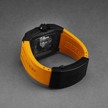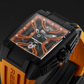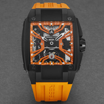 Black titanium case with a orange rubber strap. Fixed black titanium bezel. Orange dial with black hands and index hour markers. Minute markers around the outer rim. Dial Type: Analog. Luminescent hands and markers. Automatic movement. Scratch resistant sapphire crystal. Pull / push crown. Solid case back. Rectangle case shape, case size: 40.35 mm, case thickness: 13.5 mm. Band width: 28 mm. Deployment with push button release clasp. Water resistant at 30 meters / 100 feet. Functions: hour, minute. Additional Info: skeletonized property movment manuel winding, 4 hz (28,800 vph). Re-volt Series. Luxury watch style. Rebellion Re-Volt Automatic Orange Dial Men's Watch RB.REV.2H.TB.OR.